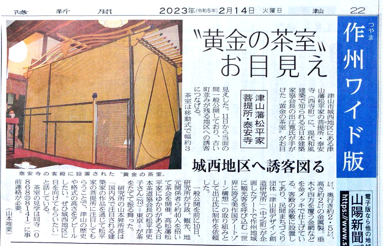 山陽新聞 “黄金の茶室”お目見え - 美都津山 – 生きている城下町 –美都津山 – 生きている城下町 –